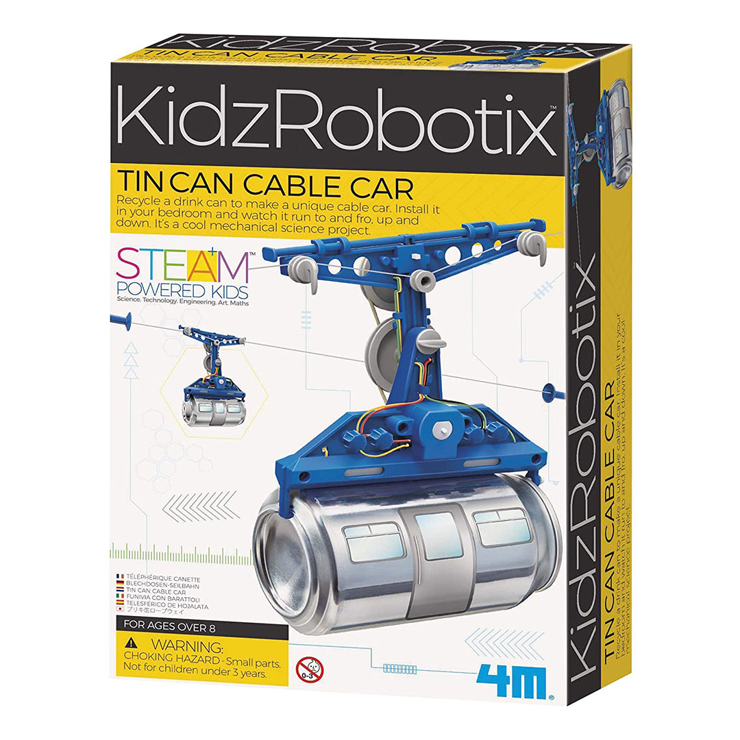 The 4M Tin Can Cable Car is a fun mechanical science project that will provide hours of fun. Recycle a used soda pop can and transform it into a functioning cable car. This kit includes all the parts necessary to construct one (1) cable car. Detailed assembly instructions included. Requires two AAA batteries and a screwdriver (not included). Recommended for ages 8 years and up.