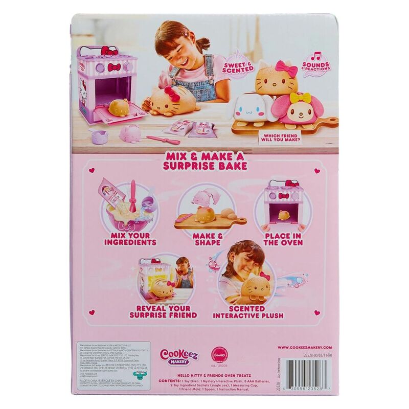 Mix, mold, and bake! The interactive oven provides a real baking experience that ends with a surprise Hello Kitty and Friends plush emerging from the oven. Discover which plush friend you’ve baked Hello Kitty, Cinnamoroll, or My Melody. Each plush is deliciously scented, adding an extra layer of fun to your child’s playtime. The fun doesn’t stop at the first bake! Children can bake over and over again, making each play session a new discovery.