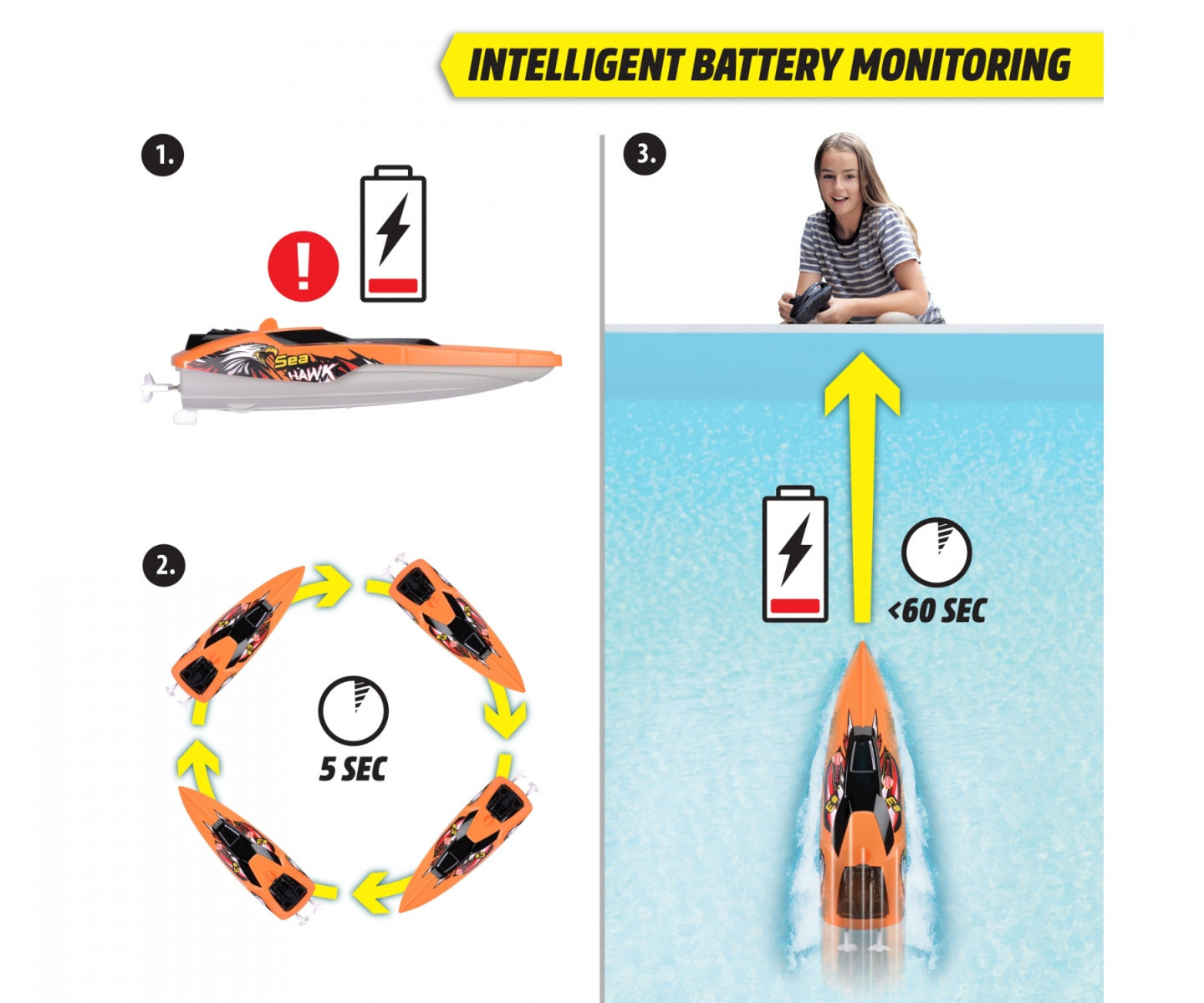 Sea Hawk remote controlled boat for pool or lake. RC "Sea Hawk" boat features a dynamic V-shaped design and can be controlled from a distance of up to 30 meters. Thanks to the powerful motor, the boat cruises at 2.5 km/h, and also comes with a turbo function that increases the speed to 4 km/h. The remote control is easy to use and suitable for children aged 6 and above.