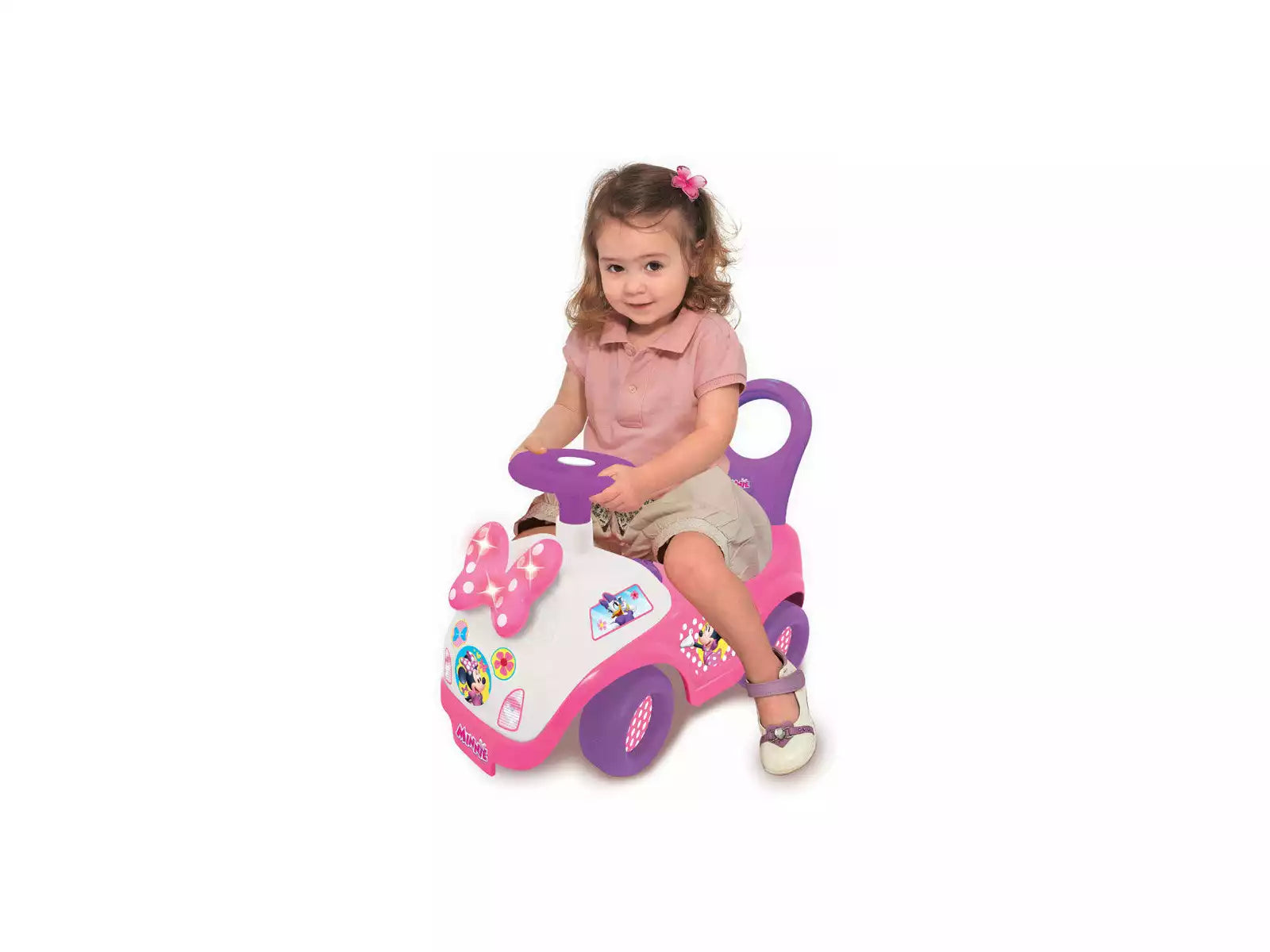 • Includes: 1 pink, white, and purple ride-on toy featuring a special Minnie Mouse design, lights and sounds, interactive activities, a steering wheel with horn, plastic wheels with anti-slip treads, a backrest with walking handle, a light-up bow, and many other charming details