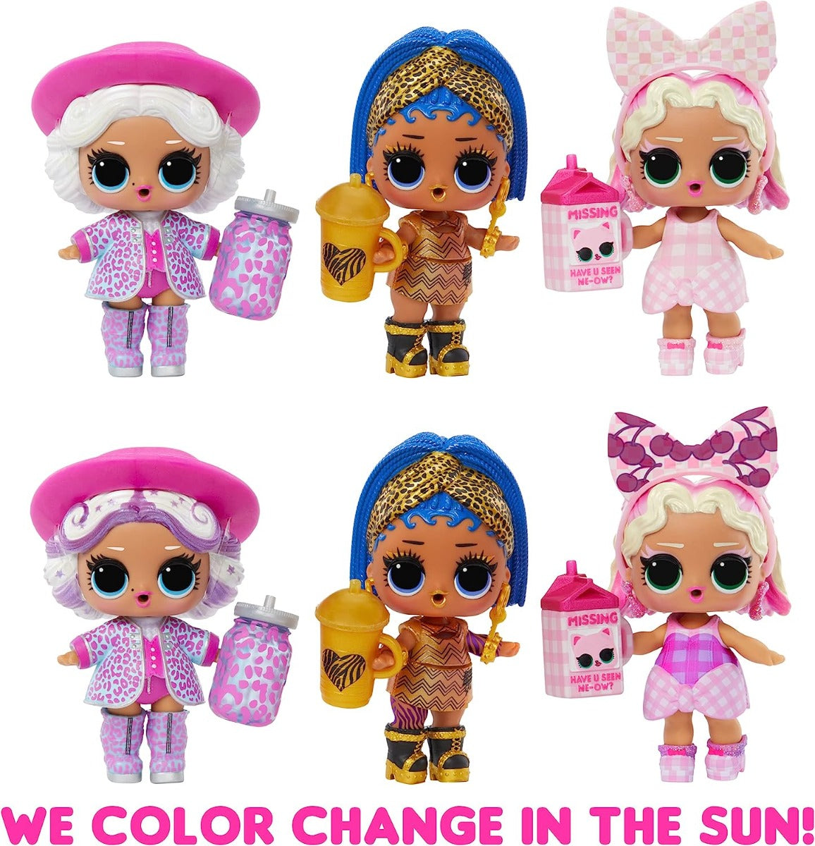 COLOR CHANGE FROM SHADE TO SUN: L.O.L. Surprise Sunshine Makeover introduces an all-new sunlight color change surprise. Watch the color change disappear and reappear when you take your tot from shade to sun and back.8 SURPRISES: (1) L.O.L. Surprise. Sunshine Makeover Doll; (2) Outfit; (3) Shoes; (4) Bottle; (5) Bottle; (6) Accessory; (7) Secret Message; (8) UV Color Change.Feed your doll for a water surprise. Will she spit, cry, or tinkle.Collect all 12 L.O.L. Surprise Sunshine Makeover dolls.