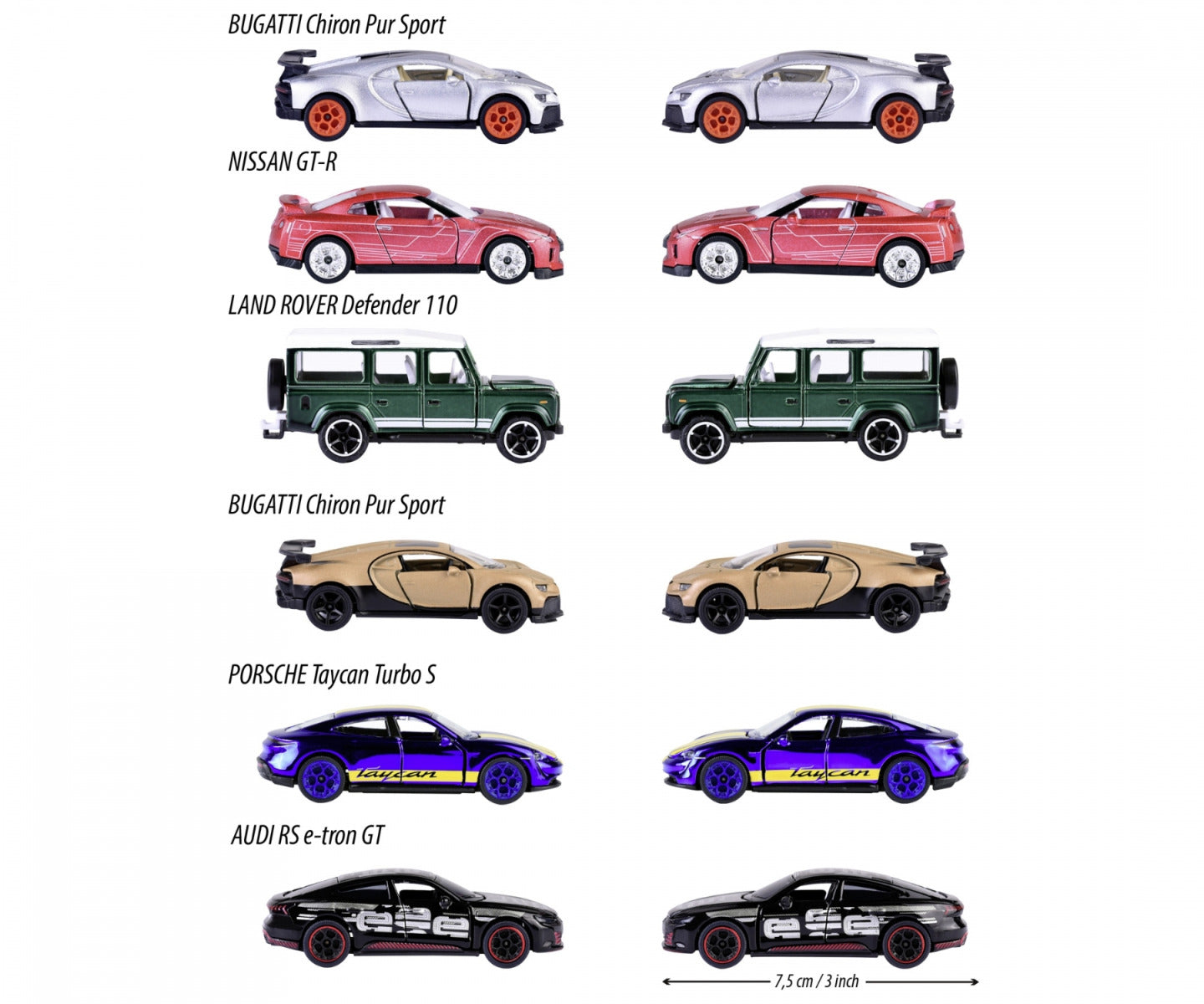 Majorette - Deluxe model car (1 car) with exclusive design, 1 of 6 toy cars (Audi, Bugatti, Land Rover, Nissan, Porsche) with die-cast deign and collector’s box, 7.5 cm