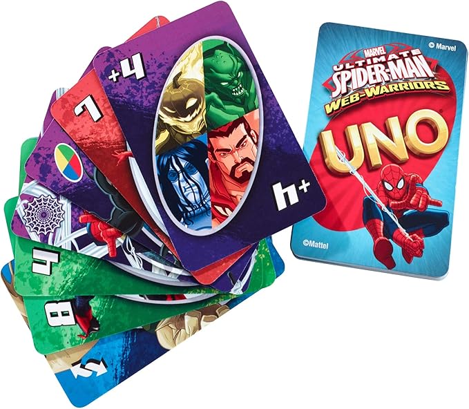 Channel your inner spider-sense in this Spiderman version of UNO game! Classic UNO rules apply, yet with the addition of a special rule and 4 corresponding action cards, players get the chance to experience all new game changing moments! Unleash your own webbing with the Web Slinger Card, which allows you to “sling” up to three cards of the same color at any other player or players you wish! This card also acts as a wild card so that you get to choose the color that resumes play. Fans of the Spiderman comic strip and movies will recognize their favorite comic book hero featured on the cards they play. And don’t forget to yell “UNO” when you only have one card remaining! Includes 112 cards and instructions. Colors and decorations may vary.