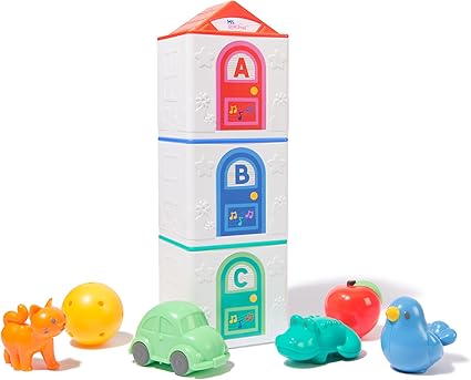 • Includes: 3 Stacking Houses, 1 Toy Apple, 1 Toy Car, 1 Ball, 1 Toy Alligator, 1 Toy Bird, 1 Toy Cat, 1 Learning Card