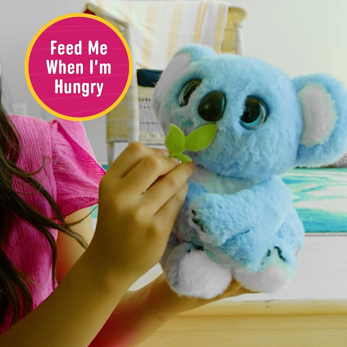 He holds and nuzzles your arm.Pet his head and belly or press his nose for loving reactions and sound.His cheeks glow different colors to express his mood and needs.Includes snack accessory.Over 50 adorable reactions!