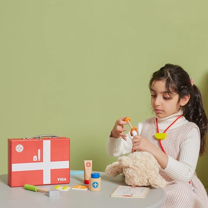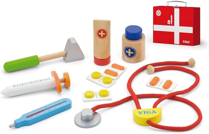 This brand stands out for more than 20 years of experience and high quality. Throughout Europe, Vigatoys excites the world of children and promotes their development. The toy is mainly made of wood and is very robust and very colorful and elegant. The bright colors inspire you to play and explore with precision every time. Thanks to its robustness, the wooden toy is particularly durable and will last a long time. This assortment in the online store thousands of children will find a perfect gift for many different ages. Whether it's colorful dice and games for the little ones, or great accessories for role-playing games for older children.Numerous accessories such as syringe, tablets, stethoscope and medicine.