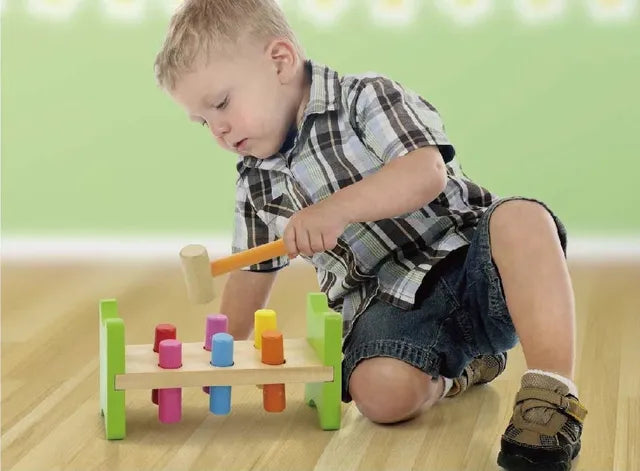 Pound- A - Peg - This classic toy will provide hours of stimulus play. Hammer colourful wooden pegs until they push through the other side. The pegs fit firmly within the bench they can't fall out but can be removed if desired, the bench has a rubber gasket within each peg hole. The bench is packaged in a colourful cardboard tray and shrink wrapped.